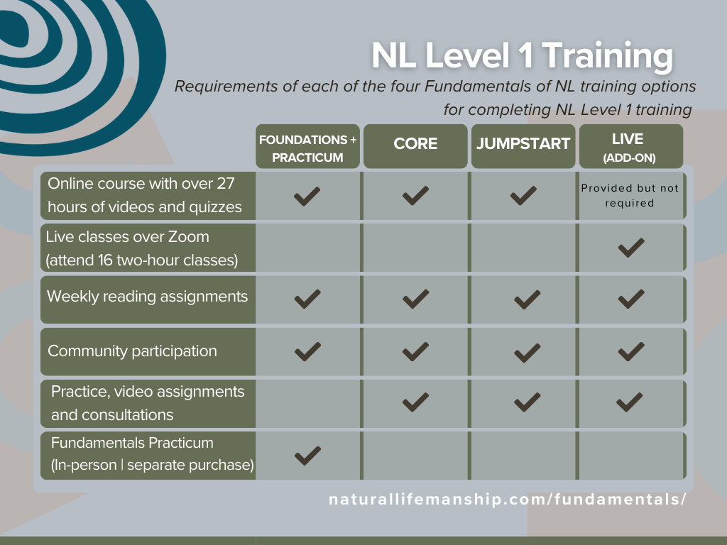 Completing this training* makes you Natural Lifemanship Level 1 Trained and fulfills one of the requirements of certification, should you choose to pursue it.